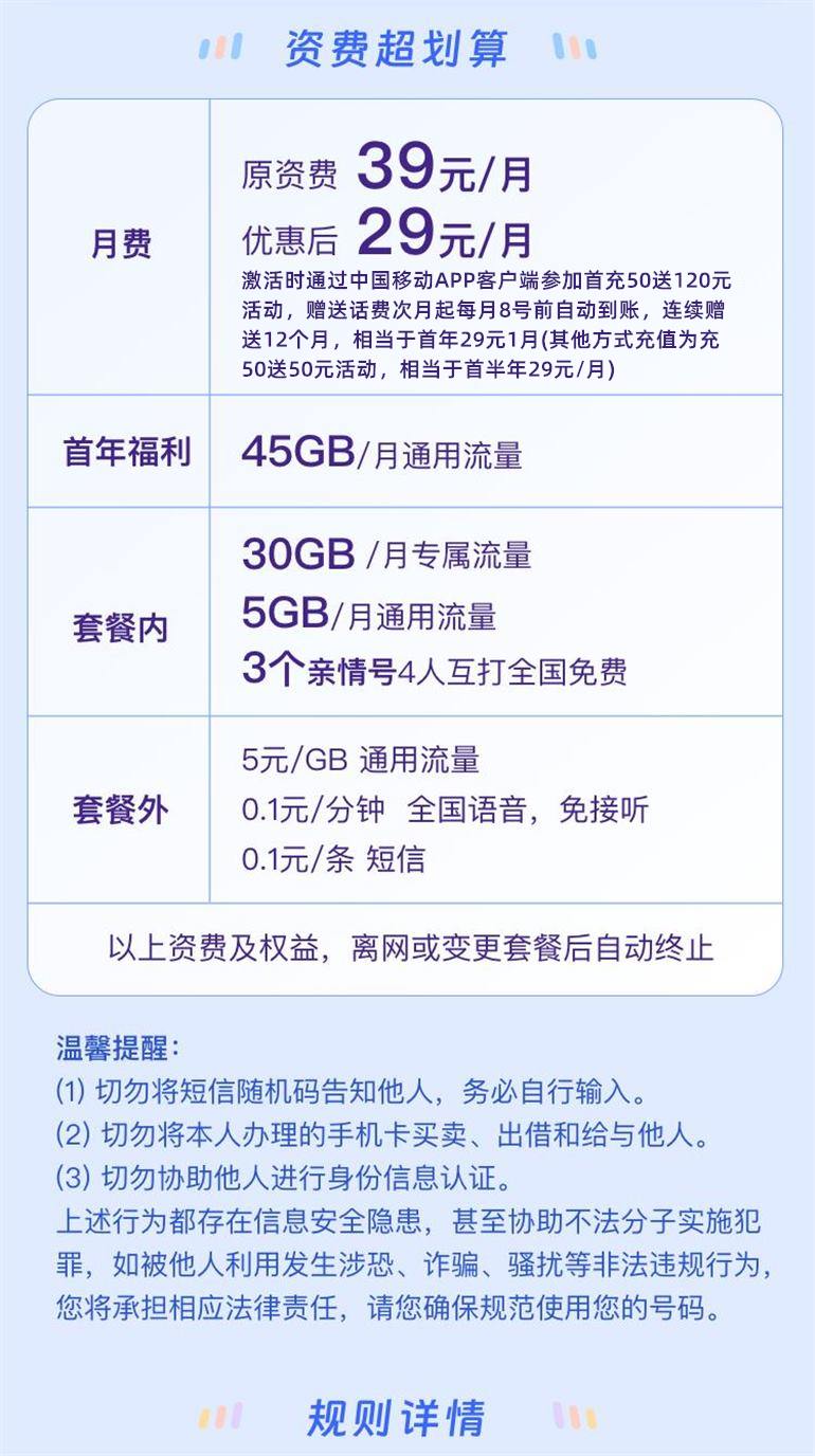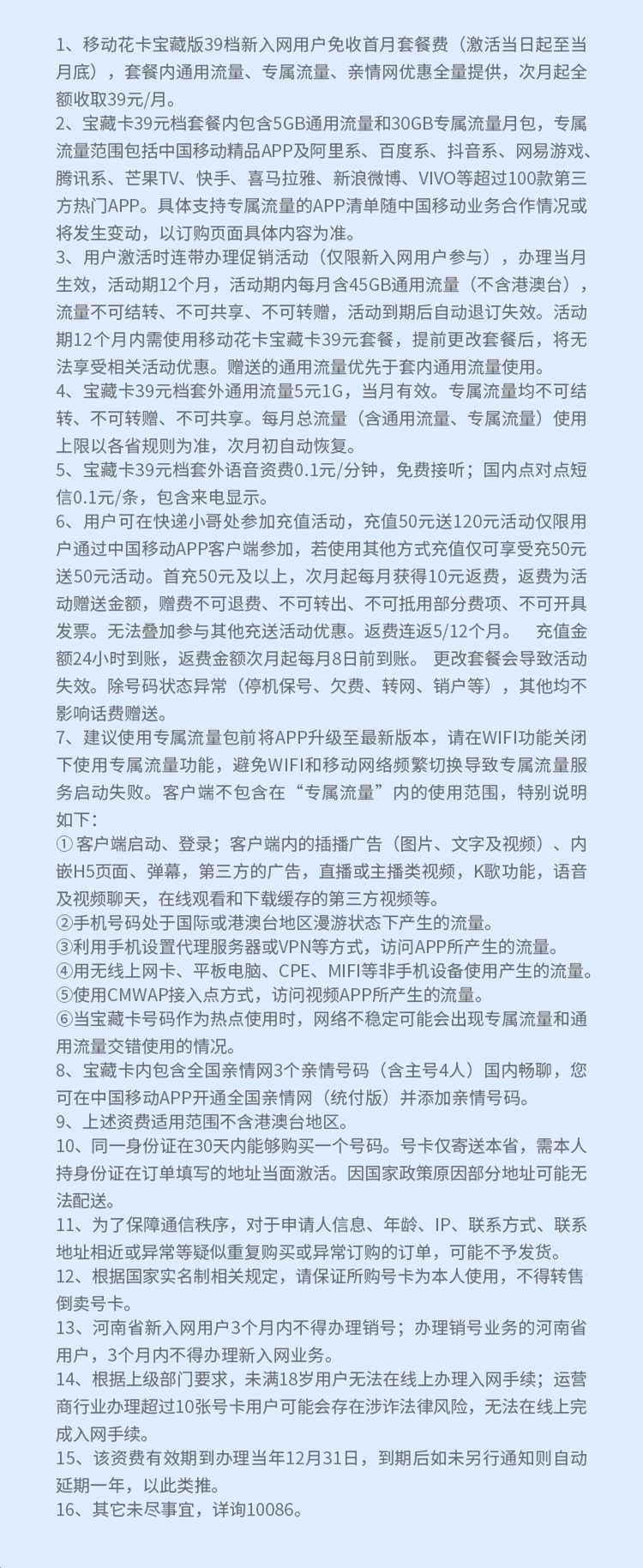 2:一張身份證最多辦理5個中國移動號碼,同一身份證僅限申請一張移動大王卡,在新號碼 為激活前不能再次購買,系統根據IP地址、收貨地址、收貨電話判斷為囤號、養卡的、 將拒絕發貨,感謝理解。